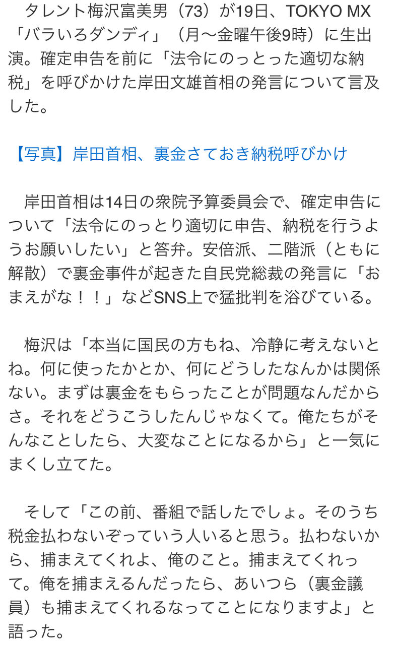 【ご意見番】梅沢富美男さん、自民党裏金問題に激怒 2024年02月24日 カテゴリ:タレント (出典 s.mxtv.jp) ごもっともや(出典 梅沢富美男「俺も税金払わないって人が出てくるよ。俺を捕まえるなら自民議員も捕まえろってなる」)1 それでも動く名無し :2024/02/24(土) 11:03:26.67 ID:S90peFrHdとみお… (出典 i.imgur.com) (出典 梅沢富美男「俺も税金払わないって人が出てくるよ。俺を捕まえるなら自民議員も捕まえろってなる」) 【【ご意見番】梅沢富美男さん、自民党裏金問題に激怒】の続きを読む タグ :#梅沢富美男#バラいろダンディ#自民党#裏金#脱税